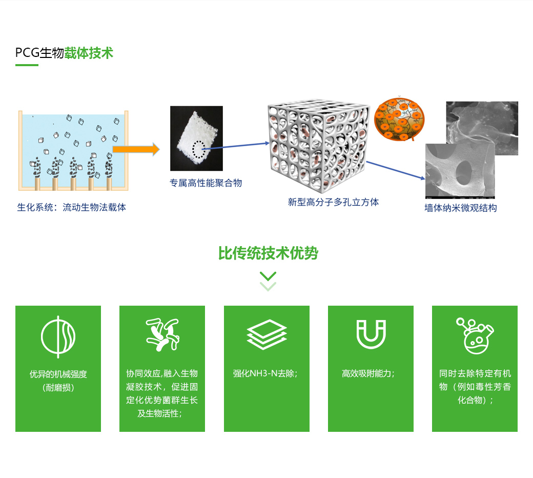 PCG是一种以高分子亲水材料为基材的水处理生物载体产品,源自日本设计灵感,参考日本20年左右的应用经历。我司技术研发团队从2010年开始对软性生物载体进行开发,经过6年的设计与开发,最终选择以高亲水性,生物亲和性,抗磨损性,通气性及强大的比表面积的高分子新材料作为生物载体的基材,并于2016年问世。历经5年的小试与中试试验,最终于2020年投入规模化生产。作为生物载体,PCG领先于国内同类型产品。
